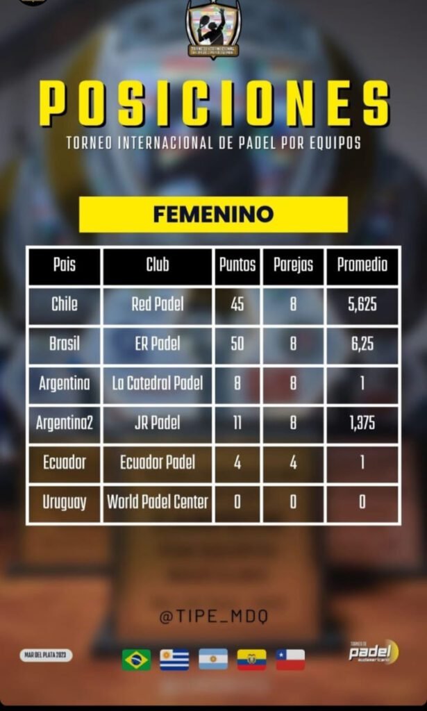 A Equipe Feminina do ER Padel, representante brasileira no Torneio Internacional de Padel Por Equipes realizado no último final de semana na Argentina, foi a grande campeã da disputa por equipes. Com um total de 50 pontos, a equipe ficou logo a frente da equipe do Chile, segunda colocada com 45 pontos.