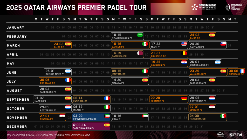 Já o Cupra Costa Daurada Tarragona Premier Padel P1, marcado para 28 de julho a 3 de agosto, será realizado em ambiente indoor no Palau d’Esports de Catalunya, na cidade de Tarragona, Espanha.