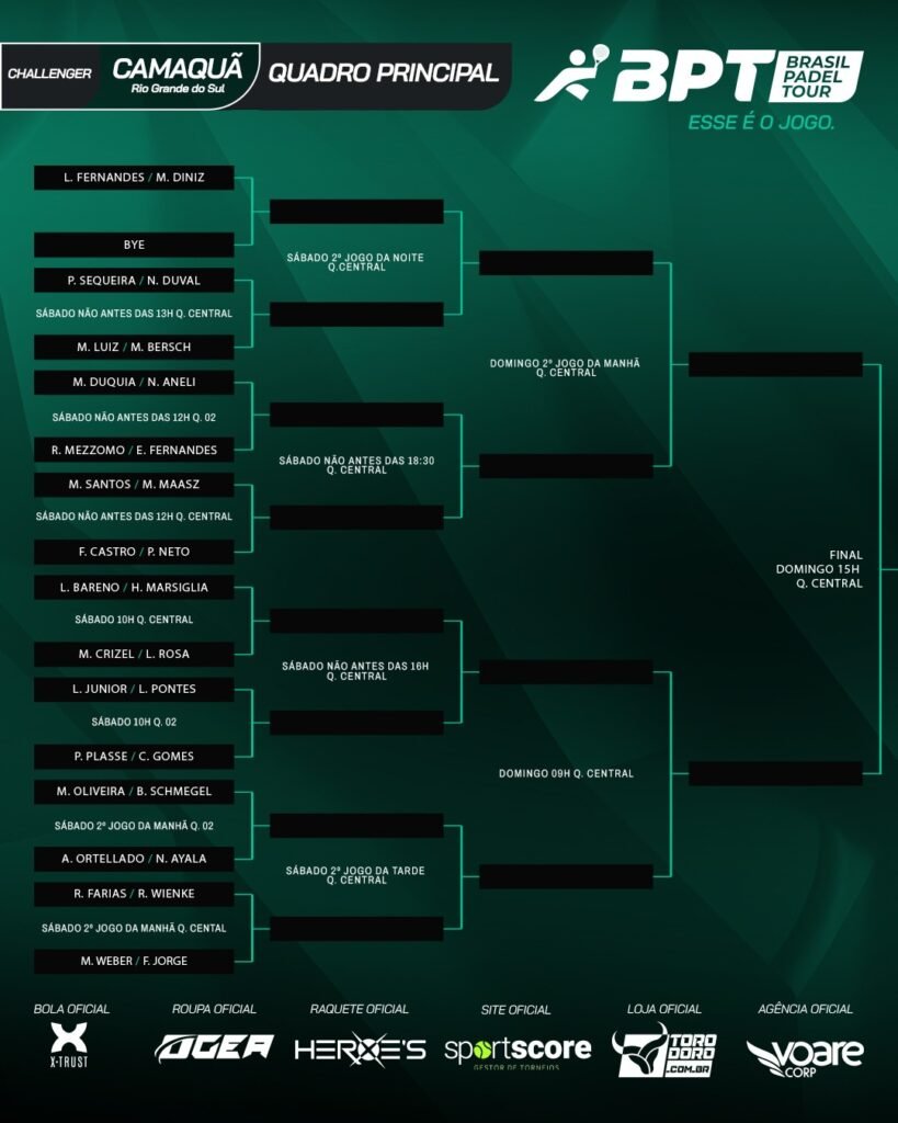 A cidade de Camaquã, no Rio Grande do Sul, recebe neste fim de semana o BPT Challenger, uma das etapas decisivas do Brasil Padel Tour. Os jogos têm início às 10h deste sábado (19), com a fase de grupos, enquanto as quartas de final estão programadas para as 16h, no Smash Padel, sede oficial do torneio.