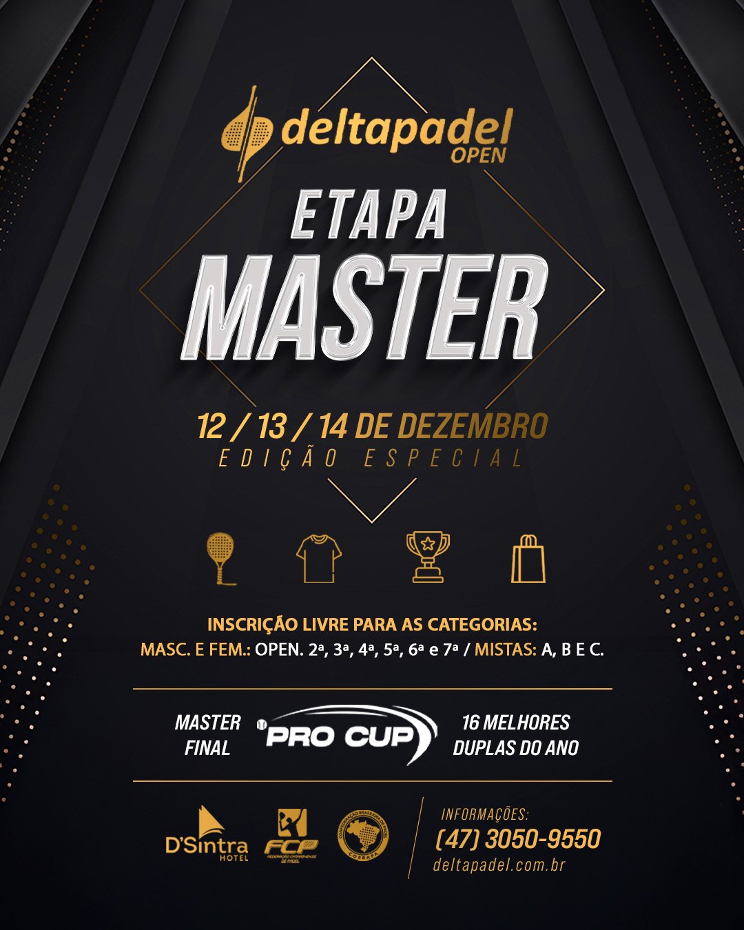 12 dezembro - 14 dezembro Delta Padel Open Master 2025 Delta Padel R. Antônio Lopes Gonçalves Bastos, 1043 - Rodovia SC 102, Camboriú, Santa catarina, Brasil Delta Padel Open Master 2025