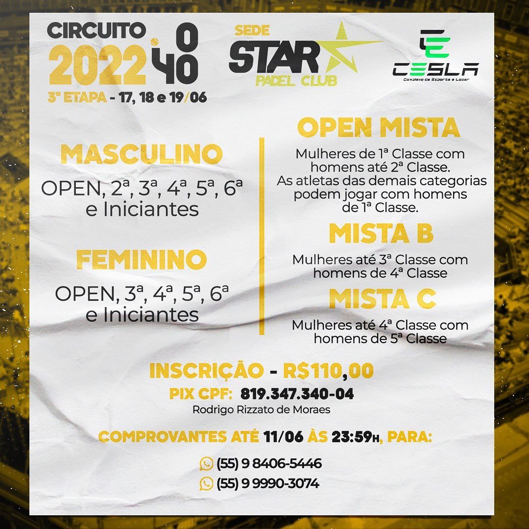 17 junho, 2022 - 19 junho, 2022 3ª Etapa Circuito 0 40 Star Padel Cesla SM Star Padel Club Diácono João Luiz Pozzobon, Santa Maria, Rio Grande Do Sul, Brasil R$110,00